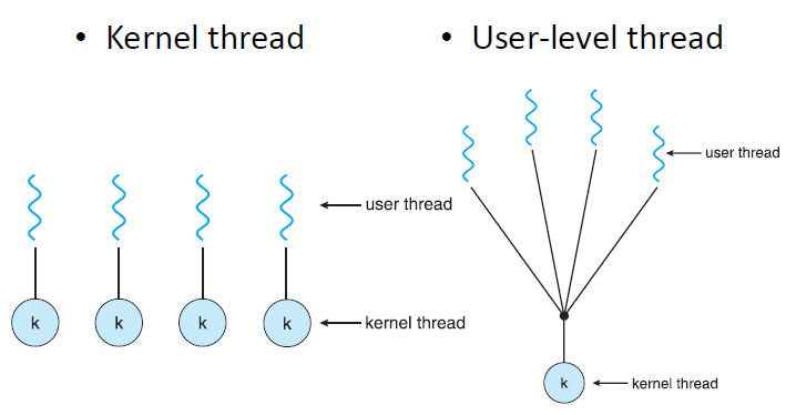 이와 반대로 프로그램에 링크된 라이브러리의 유저 레벨 함수가 관여한다면 유저 레벨 쓰레드가 되는 것이다. 커널 쓰레드에 비해 커스텀 방식으로 필요한 사항을 채택할 수 있기 때문에 lightweight하며, 커널을 거치지 않기 때문에 생성, 삭제가 빠르고, 컨텍스트 스위칭에 들어가는 overhead를 줄일 수 있다. 얼핏 보면 커널 쓰레드는 생성에 syscall이 필요해 syscall 없이 관리될 수 있는 유저 쓰레드보다 비효율적일 것으로 보인다. 실제로도 쓰레드를 생성하거나 없애는 것은 유저 레벨 쓰레드의 속도가 더 빠르다. 그런데 현대의 OS는 주로 커널 쓰레드 방식을 채택한다. 이는 왜일까.