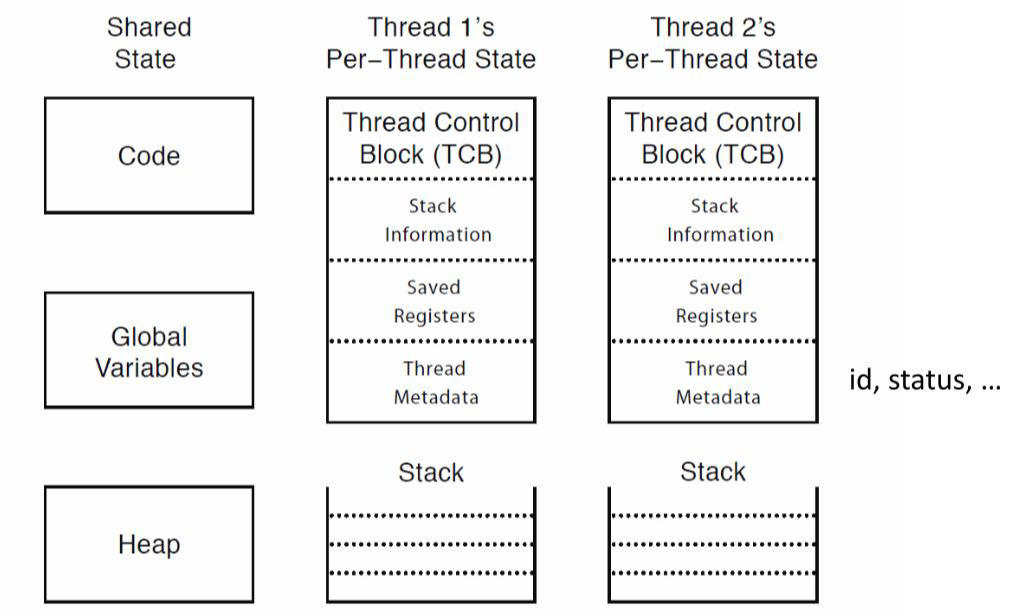 Concurrent한 OS를 만들기 위해 OS 설계자들은 새로운 abstraction을 고안했다. 바로 thread(쓰레드)이다. 쓰레드는 일련의 실행을 나열한 것으로서, 쓰레드 각각이 개별적으로 schedule될 수 있는 작업을 의미한다. 일련의 실행을 나열한 것은 말 그대로 program counter를 따라서 실행되는 일련의 명령어들의 나열을 의미한다. 또한 OS는 하나의 쓰레드를 언제든지 실행하거나, 미룰 수 있기에 schedule의 단위가 되는 것이다.