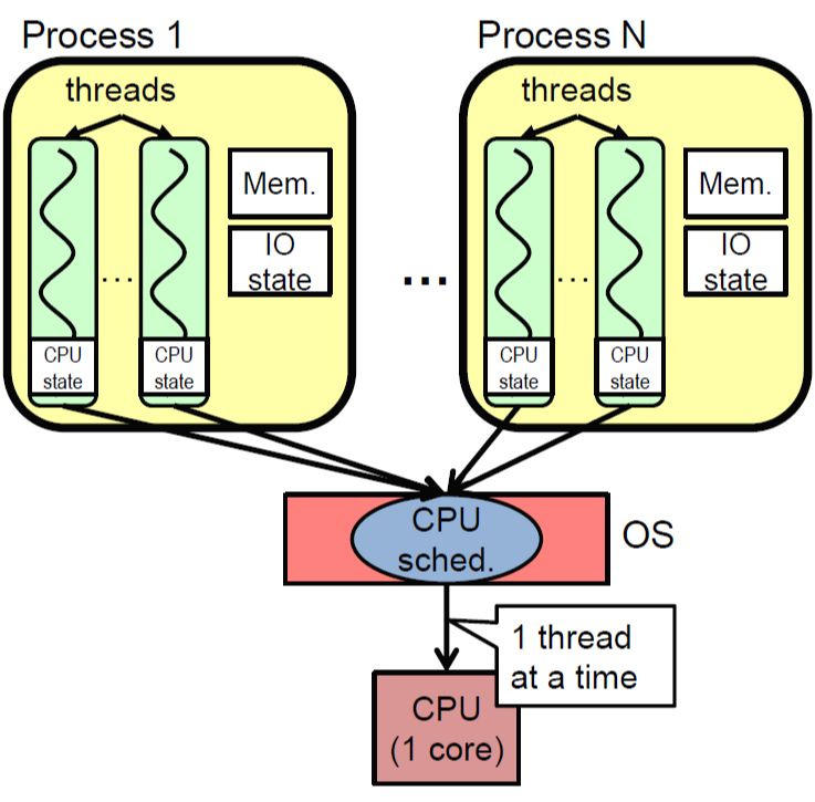 그래서 machine의 추상화였던 프로세스가 Protection Unit이었던 것과 대조적으로, 쓰레드에는 Protection이 보장되지 않는다. 대신 쓰레드는 실행의 단위, 즉 Execution Unit으로서 CPU의 추상화라고도 할 수 있다. CPU는 machine에 포함이 되어 있기 때문에 쓰레드는 프로세스에 귀속되어야 한다.