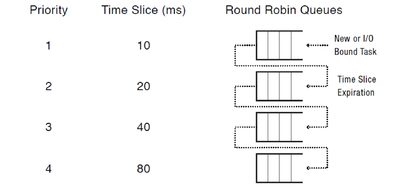 MLFQ의 특성에 의해 짧은 CPU burst time을 가지는 I/O bound job은 상위 Queue에 머무르려는 경향이 있으며, CPU bound는 하위 Queue에 머무르려고 할 것이다. 물론 아직 문제가 남아있다. priority를 사용하는 구조적 특성에 의해 I/O bound jobs가 계속 들어오면 CPU bound job에서 starvation이 일어날 것이므로, 틈틈이 priority boosting (aging) 보정 작업이 필요하다. 실제 운영 체제에서는 각 단계마다 충분한 양의 CPU를 할당받지 못한 작업들의 경우 우선도를 올려주어 적당한 양의 CPU 할당을 받도록 조정함으로서 starvation과 fairness 모두를 잡으려고 노력한다.