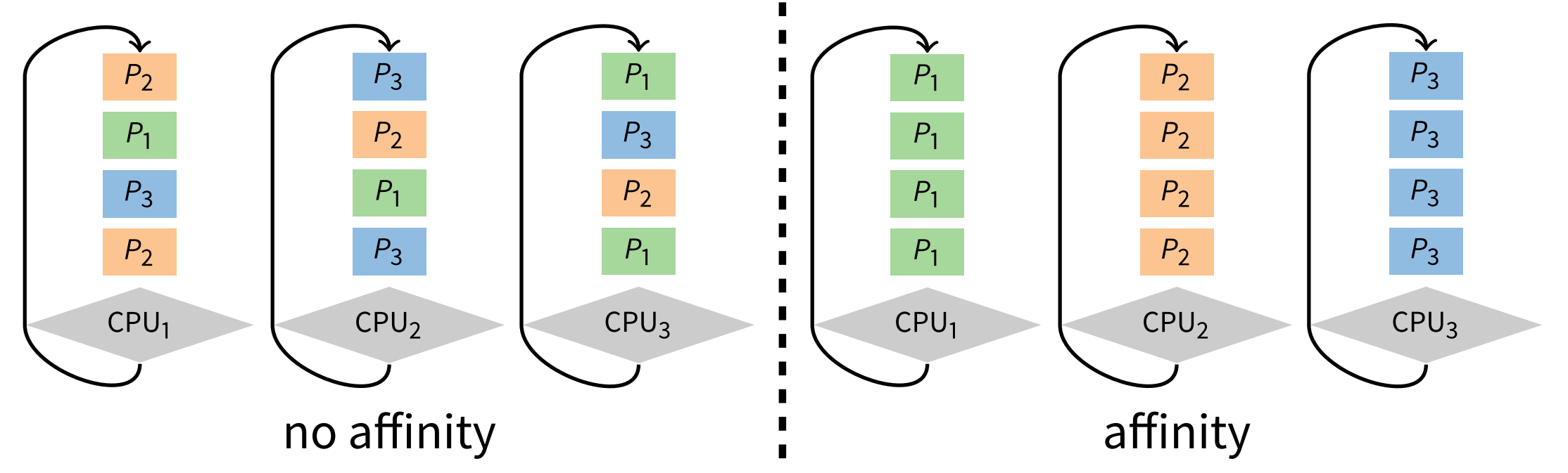 이제 각 프로세서는 고유한 ready list를 가지고 있다. 이를 가지고 처음 생각할 수 있는 것은 가장 간단한 방법으로는 쓰레드가 가장 최근에 실행되었던 프로세서의 ready list에 다시 넣는 것이다. 이러한 스케줄링을 Per-Processor Affinity Scheduling이라고 한다. 이러면 적어도 특정 작업이 여러 프로세서에 걸쳐서 실행됨에 의해 발생하는 cache 효율성 문제는 잡을 수 있다. cache hit이 증가하기 때문에 cache 활용도가 높아지는 것이다.