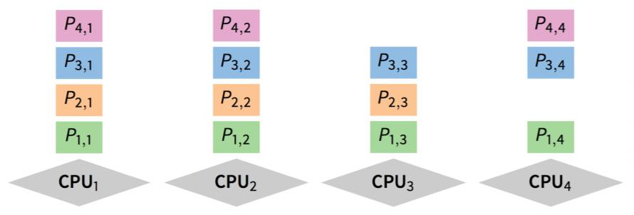 하지만 Affinity Scheduling은 문제를 가진다. 바로 parallel program을 처리하지 못한다는 것이다. parallel programming이란 복수의 컴퓨팅 자원의 이점을 활용하기 위해 한 작업을 여러 개의 작은 작업으로 나누어 동시에 여러 연산을 하는 것이다. 이를 Affinity Scheduling 대로만 처리한다면 같은 프로세서에서만 처리될 것이기 때문에 전혀 병렬 처리가 되지 않는다. 이는 아래 그림과 같은 Bulk Synchronous Patern (BSP) 같이 한 작업만 지연되더라도 나머지 모든 작업이 지연되는 상황에는 적합하지 못하다.