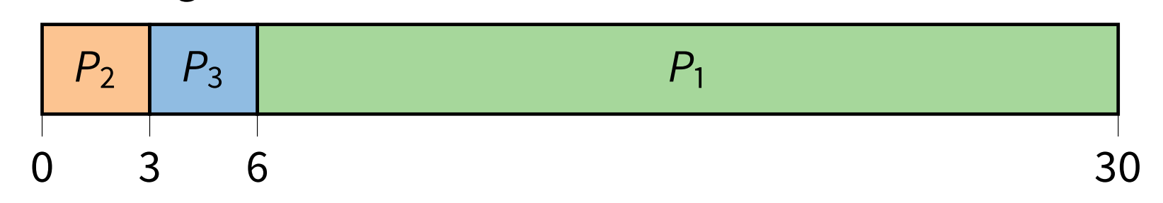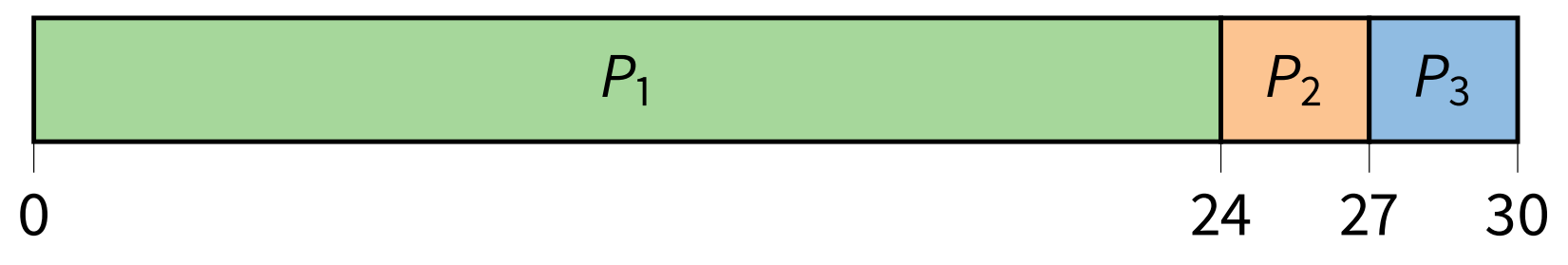 Avg Throughput의 경우 3/30으로 초당 0.1개의 작업을 완료하며, Avg Turnaround Time은 (24 + 27 + 30) / 3 = 27, Avg Waiting Time은 (0 + 24 + 27) / 3 = 17이다. Avg Throughput은 바꿀 수 없다. 정해진 실행 시간이 있기 때문이다. 대신 ATT와 AWT는 바꿀 수 있다. 바로 실행 순서를 바꿔주는 것이다. 이렇게만 해줘도 눈에 띄는 개선을 보여준다.