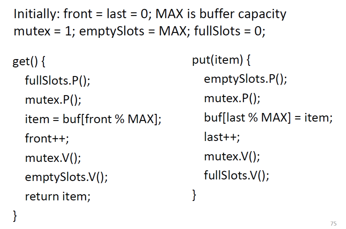 이 때 수업에서는 empty나 full 중 하나의 세마포어만을 사용하거나, 사용된 세마포어의 순서를 바꿨을 때도 정상동작할지를 생각해보라고 하셨다. 시험에 나올 것 같으니 생각해보도록 하자. 이 다음으로 살펴본 것은 Lock은 세마포어를 통해 구현할 수 있었으니, Condition Variable을 세마포어를 활용해 정확히 구현하는 것이었다.