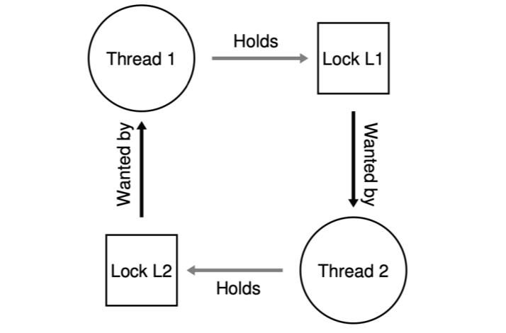 A가 Lock 1을 얻고, B로 넘어가서 B가 Lock 2를 얻는다. 다시 A로 넘어가서 A가 Lock 2를 얻으려고 할 때, A는 B가 Lock 2를 놓기까지 기다린다. 다시 B로 넘어가서 B가 Lock 1을 얻으려고 하면 Lock 1은 A가 들고 있기 때문에 B도 A가 Lock 1을 놓기까지 기다린다. 결국 두 쓰레드 모두 상대방이 놓을 리 없는 락을 무한정 기다리면서 진행이 되지 않는다. 이를 그림으로 만들면 이런 원형 대기 형태가 보인다.