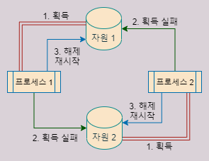 만약 두 프로세스가 있을 때, 한 프로세스가 다른 프로세스가 잡고 있는 자원을 잡으려고 하고, 동시에 그 프로세스 또한 상대 프로세스가 들고 있는 자원을 잡으려고 하는 상황을 생각해보자. 이 때, 모든 프로세스는 서로의 자원을 잡으려고 무한정 대기하는 상태에 빠지게 된다. 이러한 상태를 교착 상태, 일명 deadlock 데드락이라고 한다. 참고로, deadlock과는 대비되는 livelock이라는 것 또한 존재한다. 데드락과는 달리 뭔가 진척은 일어나는 것처럼 보이지만, 실제로는 쓰레드들이 동시에 실행되면서 락의 해제와 획득을 반복적으로 하면서 실질적으로는 아무것도 하지 못하는 상태이다.
