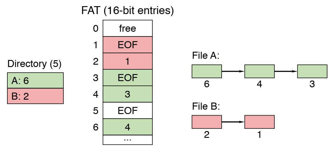 모든 파일은 블록의 linked list로 생각하되, linked file에서처럼 블록 내에 다음 블록의 정보를 저장하는 것이 아닌, 디스크의 일정 영역을 할당해 해당 부분에 모든 블록의 연결 관계를 기록한다. FAT도 이런 방식으로 구현된 index structure이다. FAT는 블록 넘버에 해당하는 엔트리에 다음 블록이 어떤 넘버를 가지고 있는지를 기록함으로 연결 관계를 가지고 있다. OS는 파일의 크기를 알고, 블록의 크기 또한 알고 있기 때문에 파일이 몇 개의 블록으로 구성되는지 알 수 있다. 해당 제한 내에서 어느 정도를 타고 들어가면 원하는 오프셋에 해당하는 블록이 나오는지 계산할 수 있고, 이는 테이블에 기록된 연결 관계로 타고 들어간다.