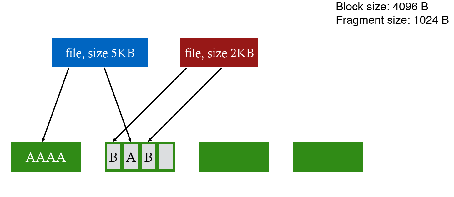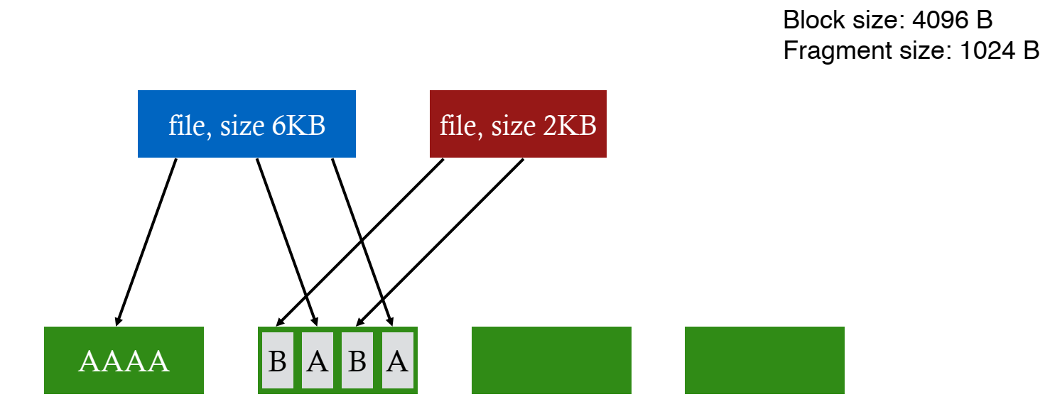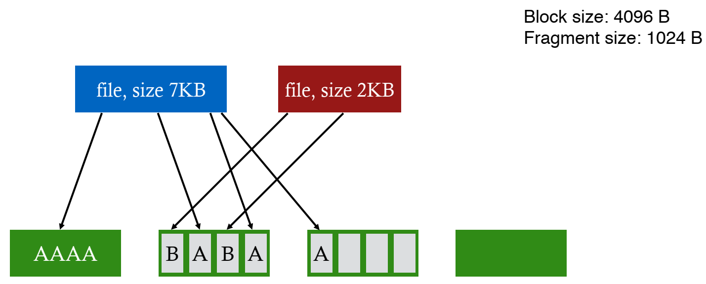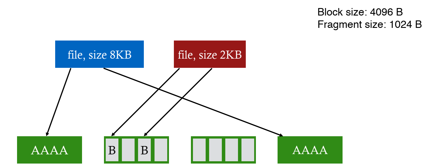 해당 문제를 해결하는 방법은 malloc에서 아이디어를 찾았다. 바로 fragments 기법이다. Allocation Unit과 Management Unit을 분리해서 생각하는 것으로, 큰 블럭 사이즈를 할당하는 것을 기본으로 하되, 해당 블럭이 작은 부분인 fragments로 쪼개질 수 있는 것을 허용하는 것이다. 작은 조각들은 작은 파일 또는 파일의 끝 부분에만 사용되는 것을 허용한다. 해당 방식의 장점은 큰 파일에 대해서 높은 transfer speed를 가진다는 것과 작은 파일이나 파일의 끝 부분에서 낭비되는 공간을 최소화한다는 것이다.