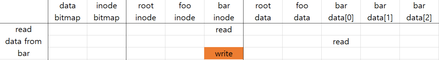 위에서 open을 해서 bar의 inode를 읽은 다음에 bar의 내용을 읽으려 한다고 하자. inode에서 bar의 data block 위치를 알아야 하기 때문에 첫 read가 일어나고, data를 실제로 읽기 위해 두 번째 read가 일어난다. 마지막으로 일어나는 write는 파일 메타 데이터 내의 access time을 수정하기 위해 일어나는 것으로, 단순 read 요청에도 block write가 일어나는 것을 알 수 있다. (총 블럭 read 2회, write 1회)