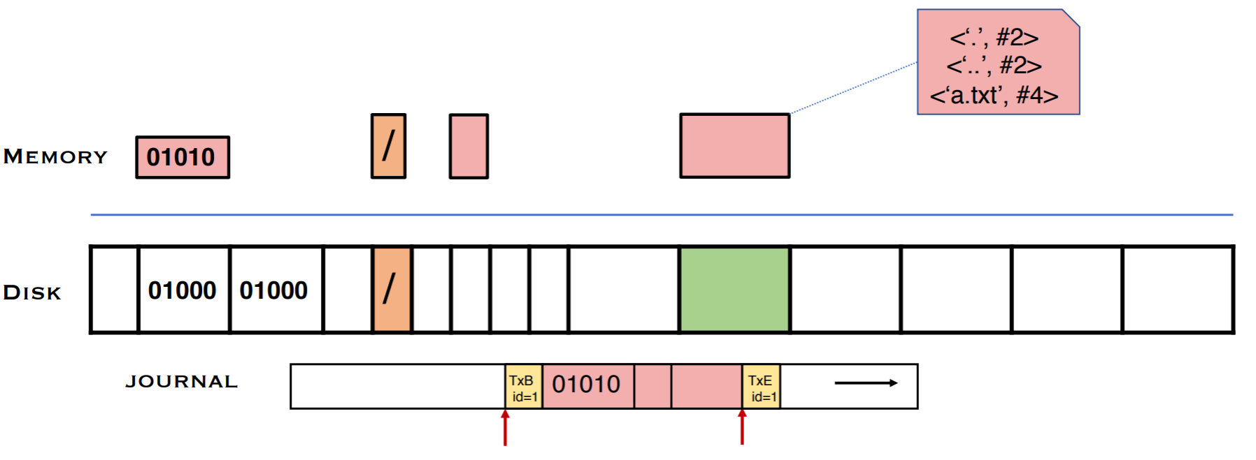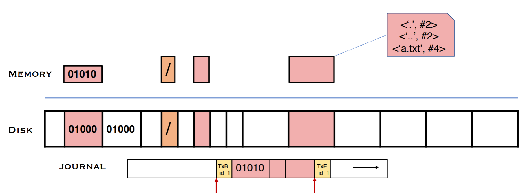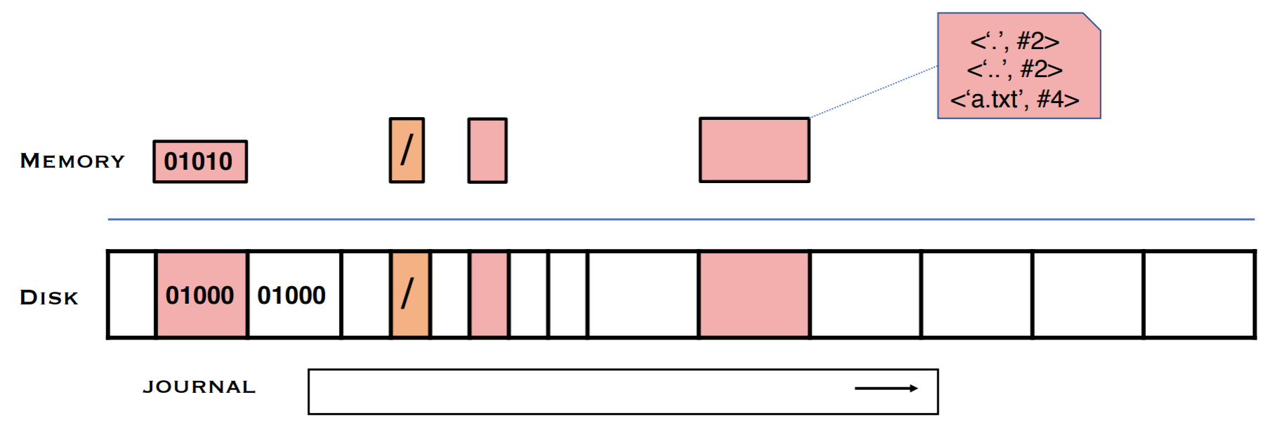 FSCK의 한계를 극복하기 위해 새로운 해법을 도입한 것이 바로 journaling이다. 저널링의 핵심은 파일 시스템에 작성하기 전에 하려는 행동(Intent)을 디스크에 작성하는 것이다. 즉, 자료구조를 갱신하기 전에 수행하고자 하는 작업을 요약해서 기록하는 것이다. 때문에 이를 Write Ahead Logging이라고 부르기도 한다. Crash가 일어나면 로그를 보면서 어떤 행동이 일어나고 있었는지를 살피고 복구할 수 있도록 한다. intent가 다 작성되기 이전에 crash가 일어난 경우에는 아무 행동도 하지 않으며, intent가 다 작성된 뒤에 crash가 났을 경우, 해당 intent가 온전히 이루어지도록 작업을 다시 진행한다.