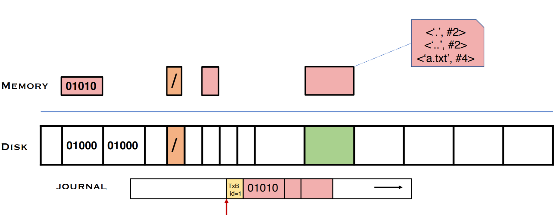 이제 Bitmap (후술 B), Inode (후술 I), Data Block (후술 D) 가 종합적으로 변경될 떄 crash가 나는 상황을 생각해볼 것이다.상황의 단순화를 위해 파일에 allocate write하는 상황을 생각해보자. 파일에 새롭게 블럭을 할당해서 write를 하게 되면, bitmap의 변동, inode 내의 블럭 포인터 할당, 데이터 블럭에 내용 설정으로 B, I, D에 변화가 종합적으로 일어난다. 이렇게 여러 개의 블럭이 update된 상태에서는 여러 개의 블럭이 디스크에 작성될 필요가 있다. 그러나 디스크와 SSD에서의 atomic write의 단위는 블럭(섹터)이기 때문에 여러 개의 섹터 중 일부만 스토리지에 반영이 되고 crash가 난다면 inconsistent한 state가 되기 때문에 문제가 생긴다. 여러 개의 블럭들이 반영이 되는 순서를 정하려고 하더라도 IO scheduler가 퍼포먼스를 위해 해당 순서를 reorder할 수 있고 storage 자체에도 internal hardware buffer가 있어 처리가 flush 되는데에도 reordering이 일어날 수 있다. crash consistency는 reordering에도 불구하고 지켜져야 하는 것이기에, 특정 하드웨어 디자인에 의존하지 않아야 한다.