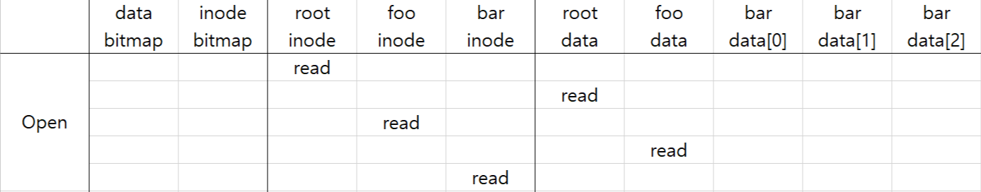 open을 하려면 root inode를 읽고, root data (directory 정보)에서 foo의 inode 위치를 알아낸다. foo에서도 마찬가지로 inode를 읽어 data를 찾고, data 내에서 bar의 위치를 찾아 bar의 inode를 읽도록 한다. (총 블럭 read 5회)