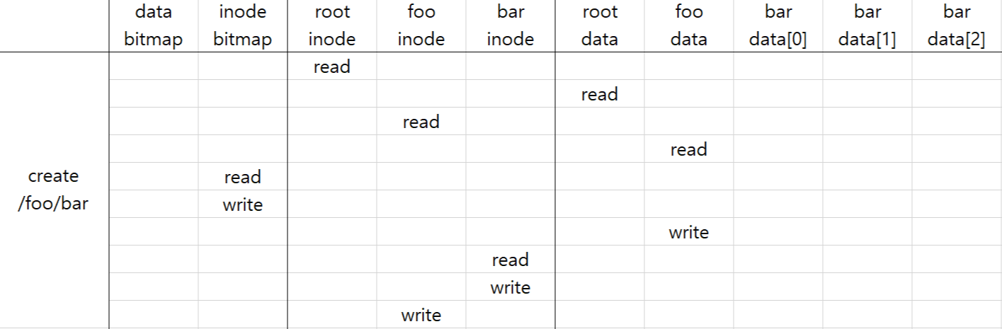 /foo가 미리 생성되어 있다는 전제 하에 새로운 inode를 할당하고, foo의 디렉토리 데이터 안에 할당된 inode 정보를 기록할 필요가 있다. 일단 foo의 data를 찾기 위해 4번의 read가 일어나고, inode bitmap을 read하여 빈 block을 찾은 뒤, 하나를 bar을 위해 할당하면서 bitmap write가 일어난다. 할당된 inode의 number를 bar의 이름과 매칭하는 페어의 정보가 foo의 directory content에 write되어야 하므로 foo data에 write가 발생한다. bar은 이제 막 생성이 된 파일이므로 inode에 메타 데이터를 초기화와 ctime(creation time)을 기록하기 위해 read와 write가 한 번씩 일어난다. 마지막으로 foo의 메타 데이터는 foo의 데이터의 변경된 내용과 일치하는 메타 데이터를 가지고 있어야 하기 때문에 modify time과 디렉토리 파일 길이 등을 변경하기 위해 마지막으로 foo의 inode에 write가 한 번 일어난다. (총 블럭 read 6회 write 4회)