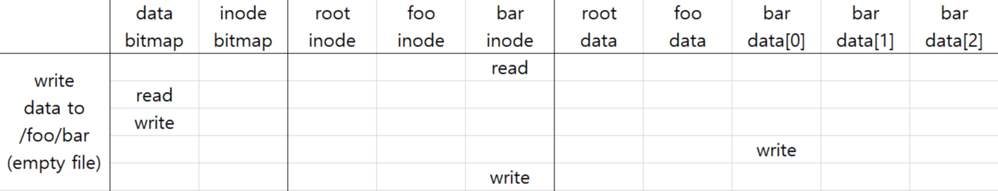 빈 파일에 쓰기 요청이 들어왔을 때는 데이터 블럭 할당이 요구된다. bar의 inode를 읽고 연결된 데이터 블럭이 없다고 판단되면, data bitmap을 읽어 빈 블럭을 하나 할당하고 할당되었다고 표시한다. 그 후 할당된 블럭에 요청한 내용을 write하고, bar의 inode에 파일의 변화 내용을 반영하도록 메타 데이터를 수정하면 write 요청이 끝나게 된다. 이를 흔히 allocating write라고 한다.