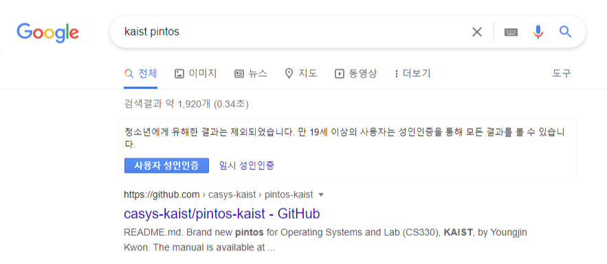 마이크로소프트 스토어에 WSL용 Ubuntu가 몇 개 있는데, 16.04는 없었다. 그래서 구글에 검색을 해 보니 이 사이트에서 16.04 버전의 Ubuntu를 받을 수 있어서 내려받아서 설치하고 WSL 2 버전으로 바꾸는 방법도 참조해 바꾸었다. Ubuntu 설치 이후, kaist pintos를 검색해 프로젝트용 레포지토리를 git에서 clone으로 받았고, 이후 수정 사항들이 내 git에 올라가도록 설정도 마쳤다. 그나저나 대체 왜 구글에서 kaist pintos를 치면 성인 인증이 뜨는 걸까...