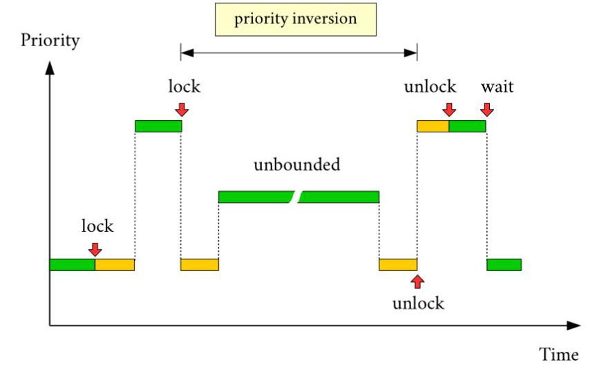 여기서 Thread M은 Thread H가 있음에도 불구하고, 자원의 접근이 없기 때문에 무제한적으로 계속 CPU에 남아있게 된다. 일정 시간마다 끊어서 다시 스케줄하는 것도 여기서는 소용이 없다. Thread H는 Block되어 있으며, Thread L과 Thread M을 비교하면 우선도가 Thread M이 더 높기 때문에 항상 스케줄러에 의해 선택되기 때문이다. 덕분에 Thread H는 자원 하나 때문에 Thread M을 무한정 기다리는 신세가 되었다. 이는 옛날 화성 탐사 로봇인 패스파인더에서도 발생했던 유서깊은 문제이다.