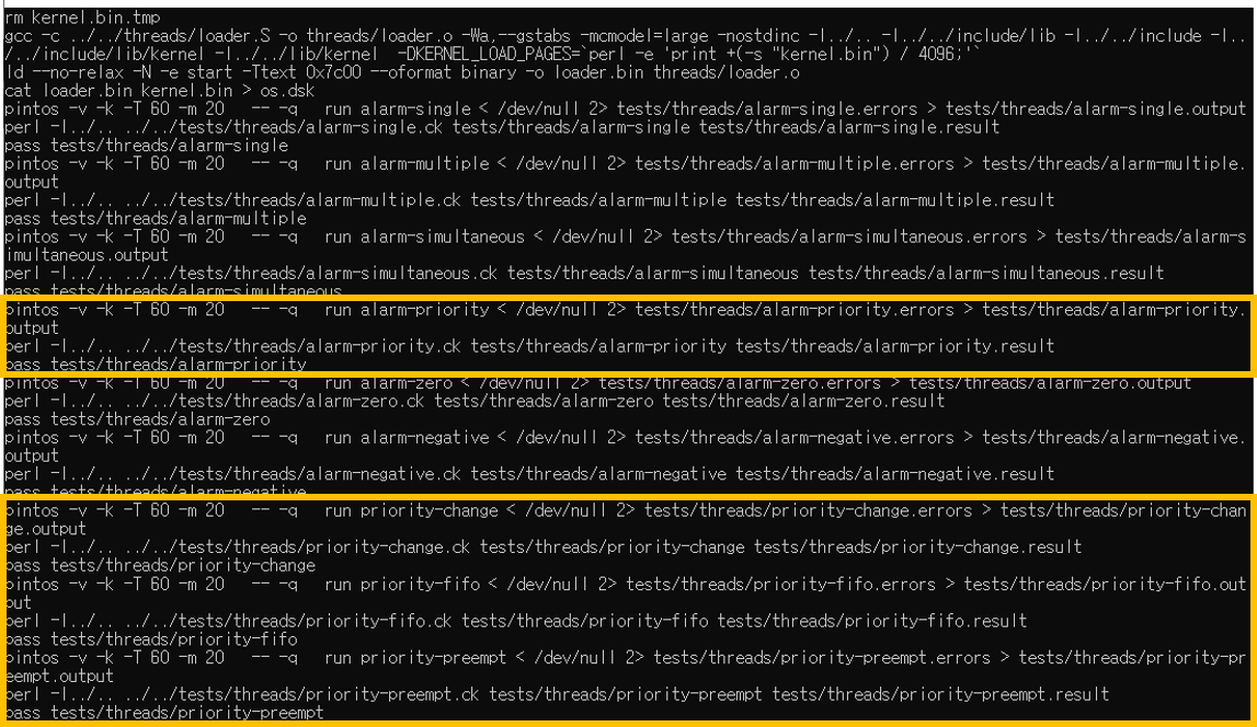 여기까지 진행을 하면, 기본적인 테스트 케이스인 alarm_priority, priority_change, priority_preempt, priority_fifo가 작동해야 한다. make check를 좀 진행하면 잘 pass하는 것을 볼 수 있다.