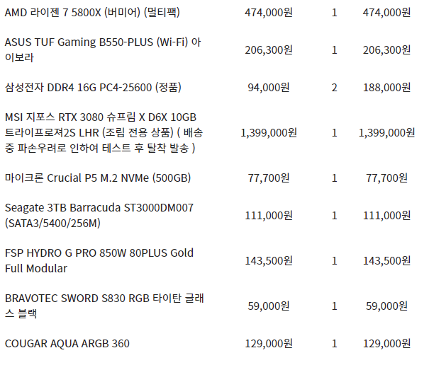 글쓰는 타이밍이 많이 늦었지만 전역 후 바로 컴퓨터를 맞춰서 잘 쓰고 있다. 그래픽카드 값이 비교적 많이 떨어진 시점이 전역하는 타이밍과 우연히 잘 맞아 떨어져 바로 구매했다. 게임용과 과제용, 두 가지 모두를 만족시키기 위해서는 거의 비교적 상옵의 컴퓨터가 필요했고, 3080Ti까지는 필요가 없다고 판단해 3080선에서 나름 타협점을 찾았다. 아래 보이는 것이 내 첫 조립 PC 스펙이다.