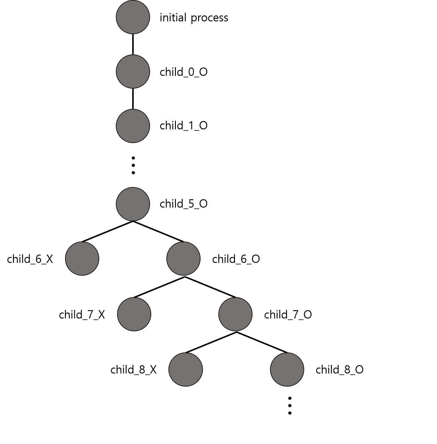 각 노드는 프로세스이며, edge로 연결된 프로세스는 부모-자식 관계를 의미한다. 끝에 X가 붙는 프로세스는 모두 consume_some_resource_and_die라는 자명한 이름을 갖고 있는 함수를 실행하고 비정상 종료하게 되고, 끝에 O가 붙는 프로세스는 다음 자식(들)을 생산하는 역할과 함께 consume_some_resource를 실행한다. 이런 식으로 타고 들어가다보면 메모리 상의 문제로 인해 child_n_O가 생성이 불가한 경우가 온다. 그 때 해당 n을 받아서 initial_process까지 올리는 것이 해당 코드이며, 그런 과정 속에 모든 자식 프로세스들은 종료된다.