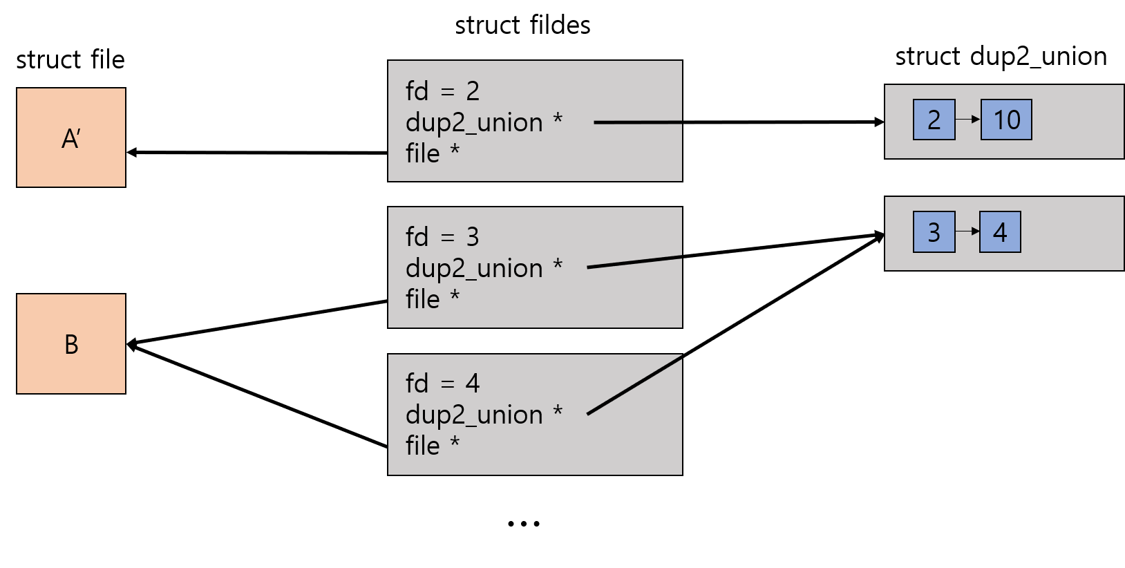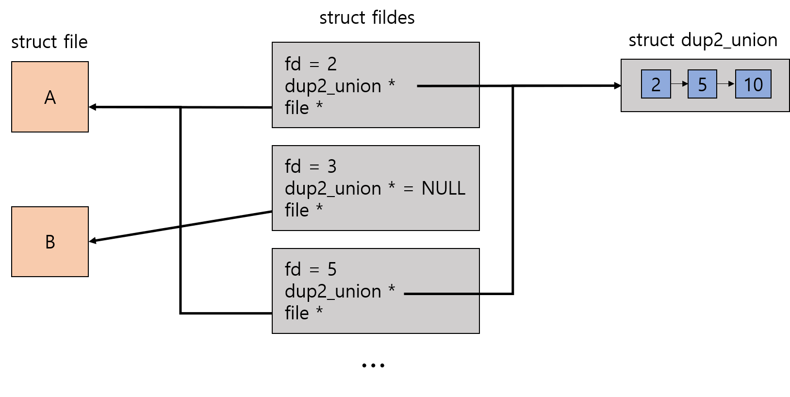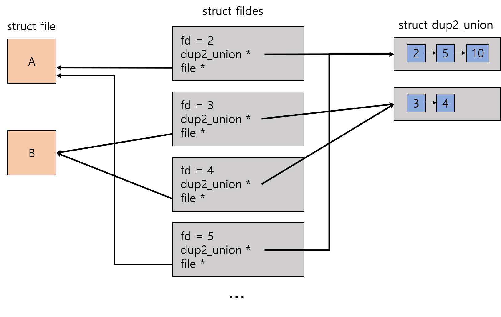 - 복사된 fd를 가진 fildes 구조체는 file 구조체를 공유한다.