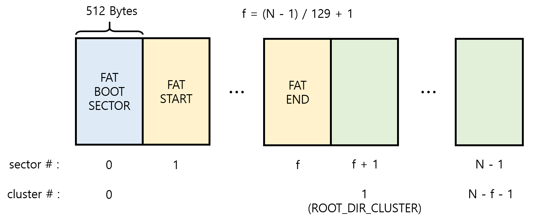 구체적인 설명은 가이드라인에서 거의 다 한 것 같으니 한 가지만 다시 짚고 넘어가도록 하자. disk에 저장되는 섹터의 구조를 살펴보면, 0번 섹터는 boot sector로 활용이 되며, 1 ~ f는 FAT를 저장하는 용도로, f + 1부터 n - 1까지의 섹터는 데이터를 저장하는 용도로 사용된다. 이제 cluster를 어떻게 할당할지를 생각해보자. f + 1번 섹터가 1번 cluster라고 한다면 n - 1번 섹터는 (n - f - 1)번 cluster가 된다. 이러한 매핑은 임의로 정한 것이지만, 가장 단순한 형태이며, 역산도 간단하기 때문에 이렇게 결정하였다. 번외로 0번 섹터는 0번 cluster에 그대로 매핑이 되지만, FAT에서는 0번 cluster를 다루지 않을 것이다. 그림으로 정리하면 다음과 같다.