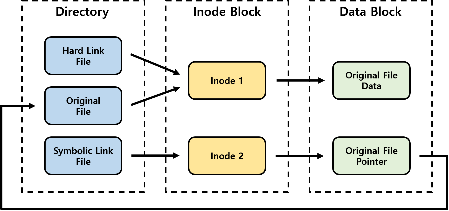 디렉토리 내에서 가지고 있는 inode는 분리되어 있되, 해당 링크 파일을 따라가면 원본 파일의 경로를 가지고 있게 된다. 이를 이용해서 링크된 원본 파일을 결국 찾을 수 있다는 것이며, 유저는 해당 파일이 symbolic 링크인지 아닌지의 여부와 상관 없이 쓸 수 있어야 한다.