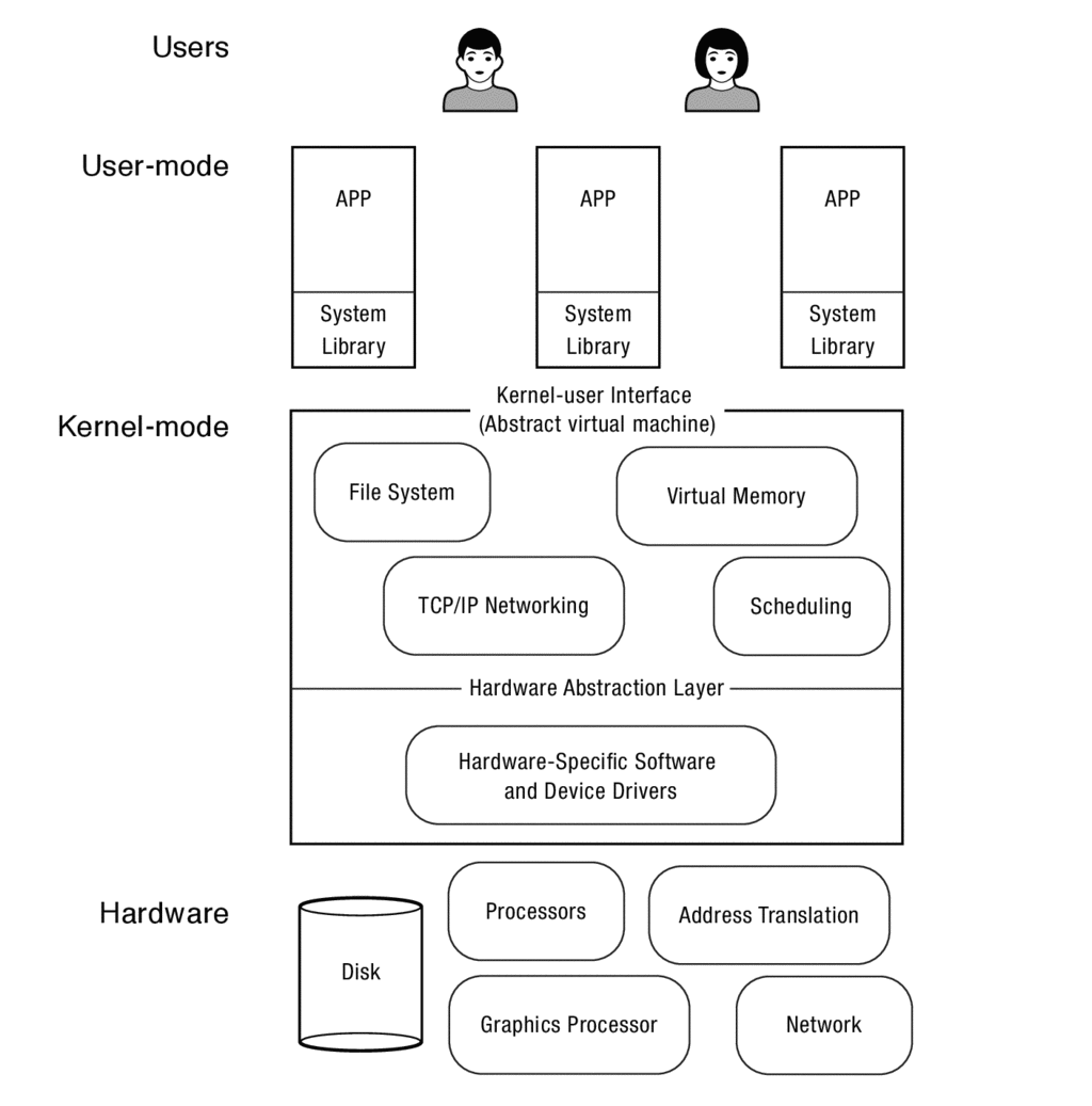 가장 낮은 단계에 있는 HW는 프로세서, 메모리, 그리고 storage를 제공한다. 또한 OS를 위한 기본적인 기능을 제공한다. OS는 SW단의 가장 하위에서 돌아가며, 일부 어플리케이션의 악의적인 행동이 다른 어플리케이션에 영향을 주는 것을 방지하기 위해, 주로 어플리케이션과는 분리된 환경에서 개별적으로 실행된다. OS는 각 어플리케이션이 개별적으로 안전하게, 그리고 HW의 제한이 없다는 환상을 주게끔, 각 어플리케이션을 개별적인 가상 환경에서 실행시킨다.