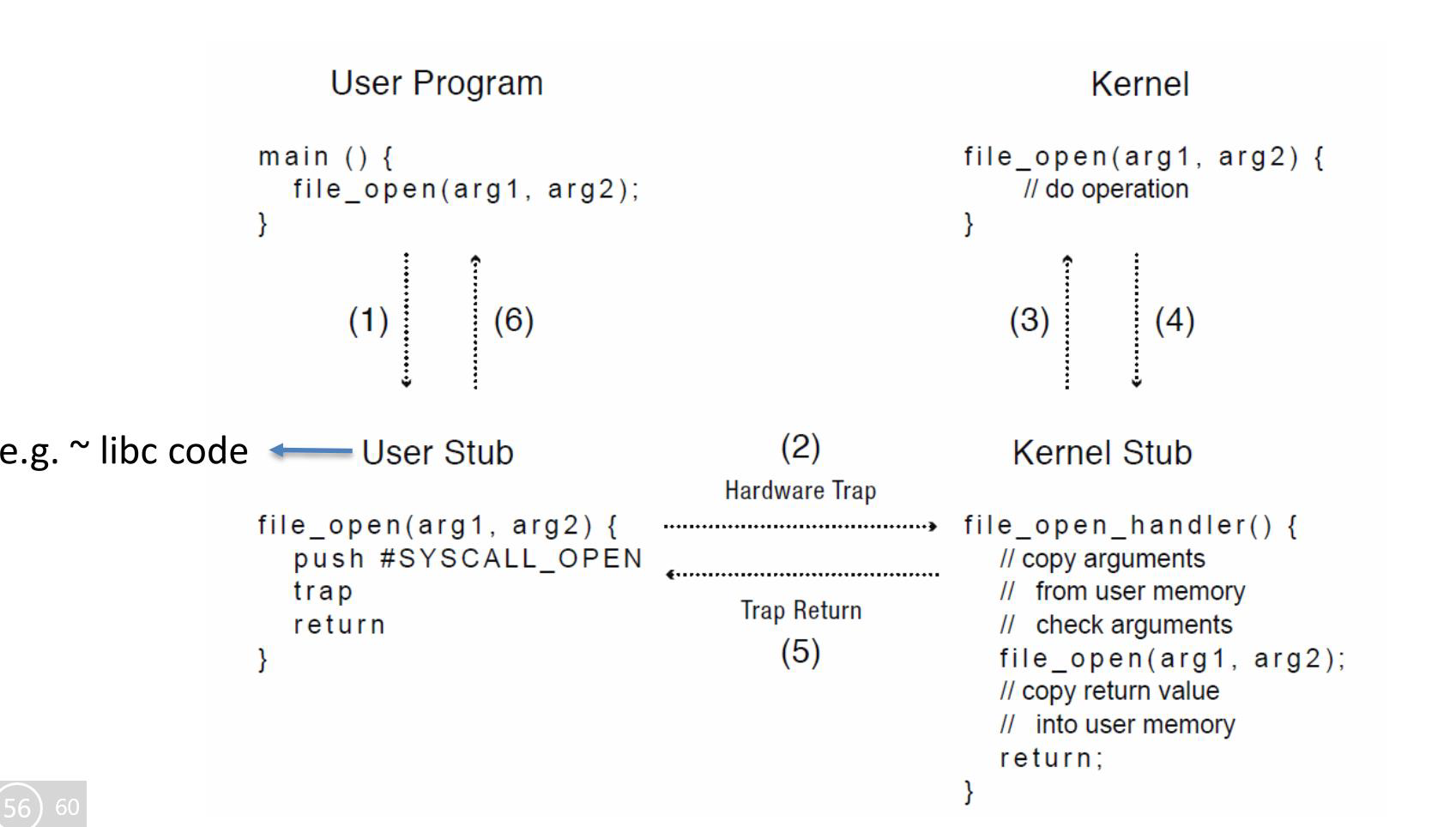 핀토스를 보면 알겠지만 Syscall 핸들링은 커널에서 일어난다. Syscall은 유저 프로세스에서 커널에게 특정 동작을 대신 수행해주도록 요청을 보내는 것이라고 볼 수 있다. 유저 프로세스에서 Syscall을 사용하면 해당 코드가 HW 트랩을 일으키면서 커널 내부에 정의된 핸들러가 실행이 된다. 모든 요청이 완료되면 다시 유저 프로세스로 실행이 돌아간다.